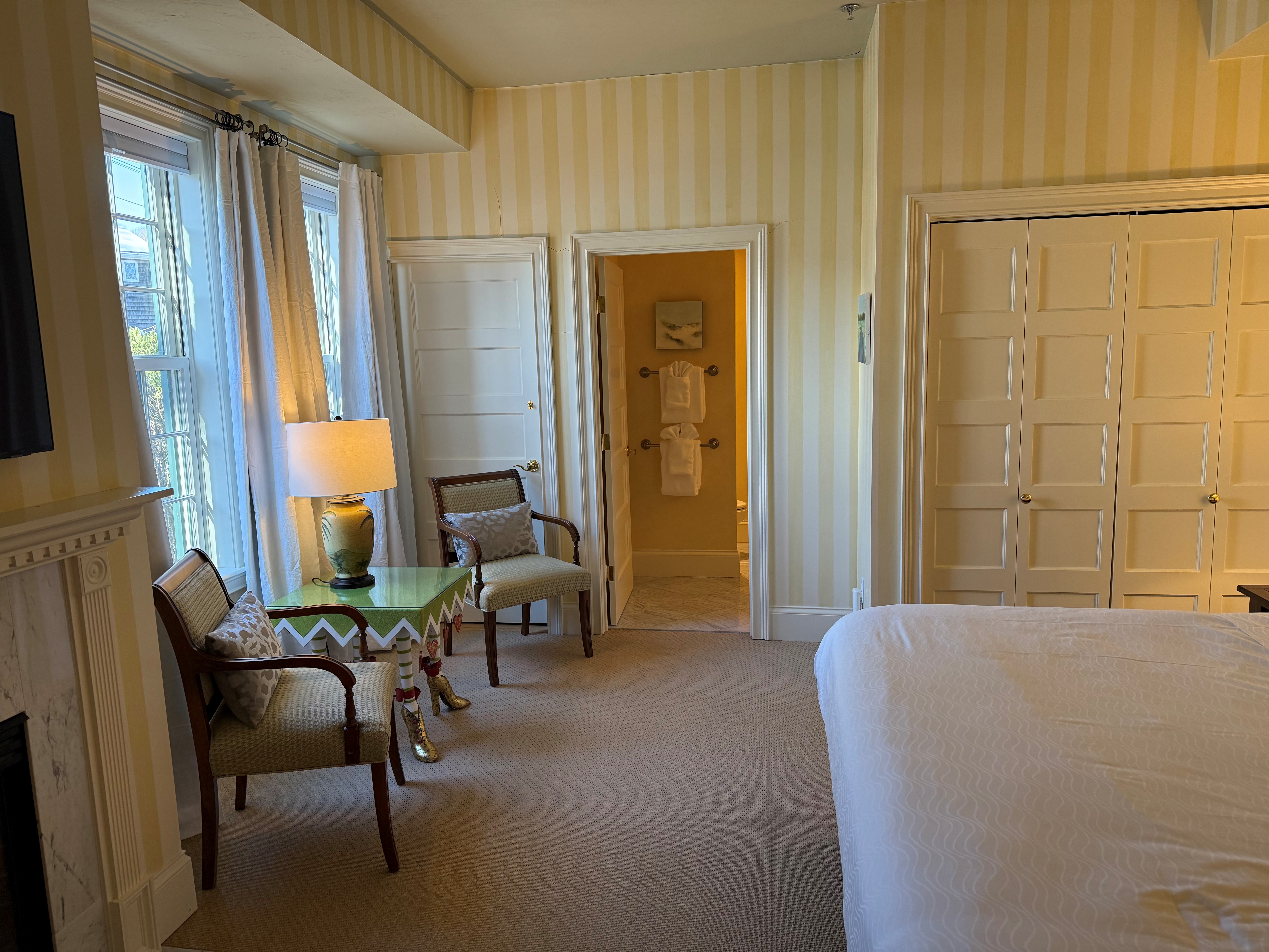 Ground Floor room with king bed. Yellow hand painted stripped walls. Marble tiled bathroom with shower and air jetted tub. Gas Fireplace.
