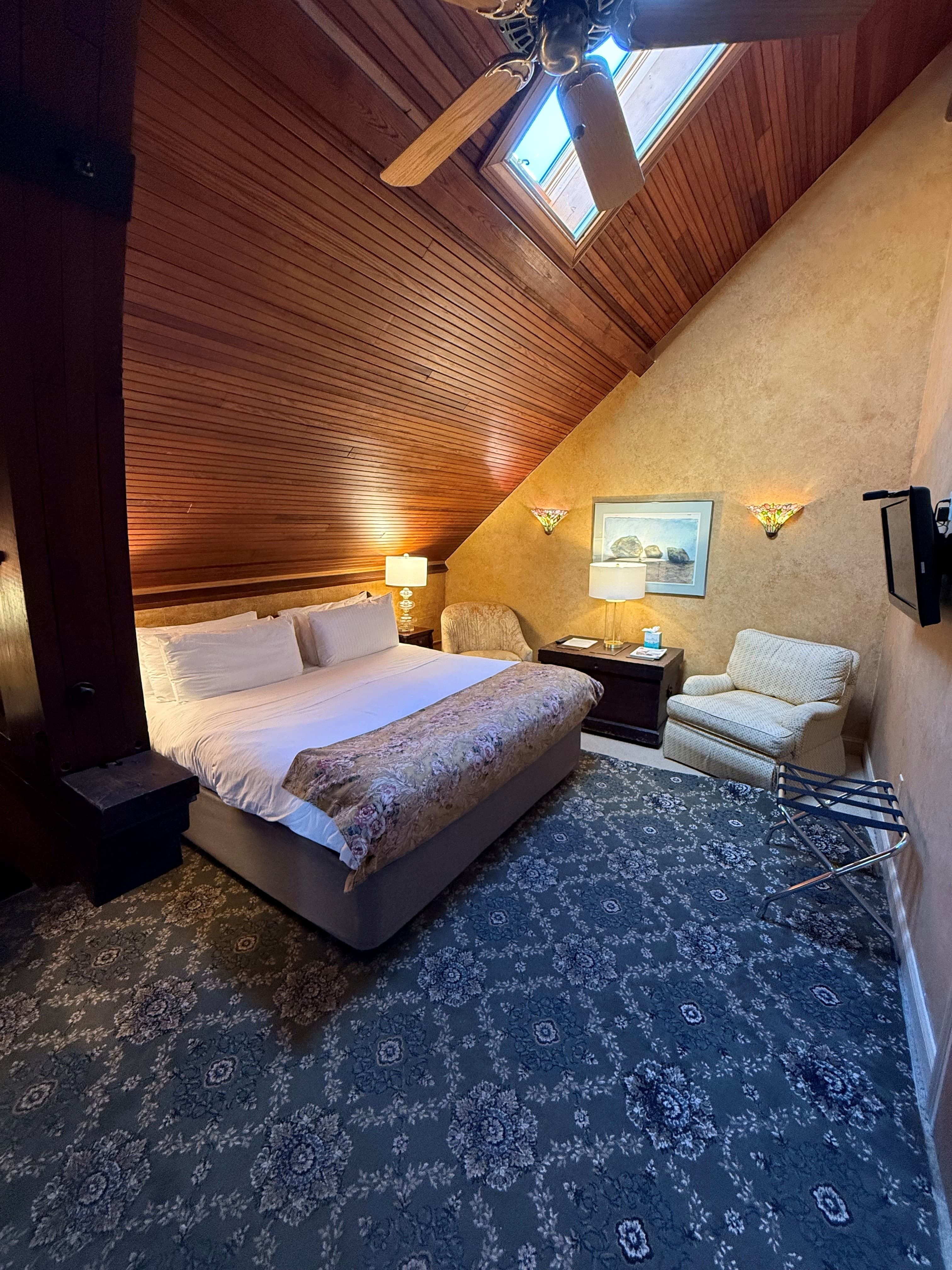 One of the Abbey's most distinctive rooms, featuring a king church-pew bed illuminated by tulip stained-glass sconces. Gold and burgundy washed walls and a skylight above the bed create a warm, enveloping atmosphere. The spa bathroom includes a rainfall shower with the BainUltra Vedana Personal Care Unit, integrating light, sound, chromotherapy, and thermotherapy for a deeply restorative experience.